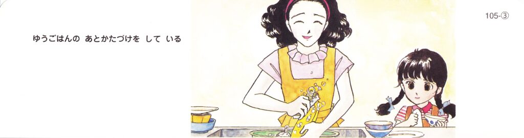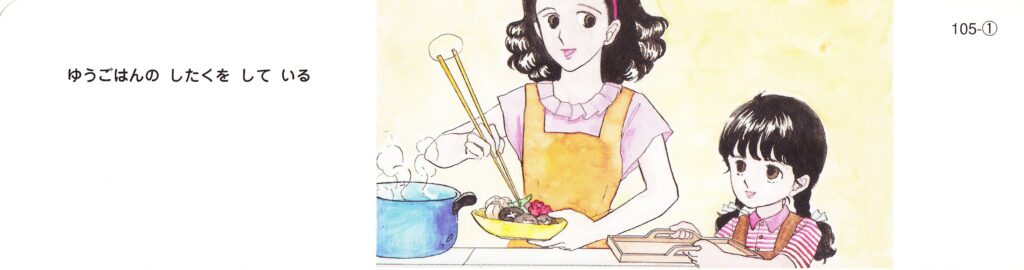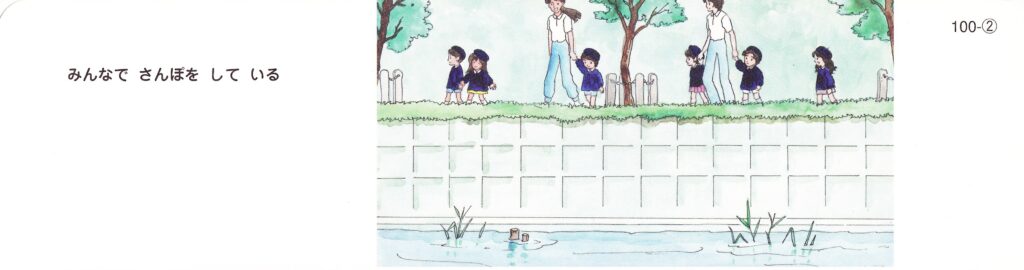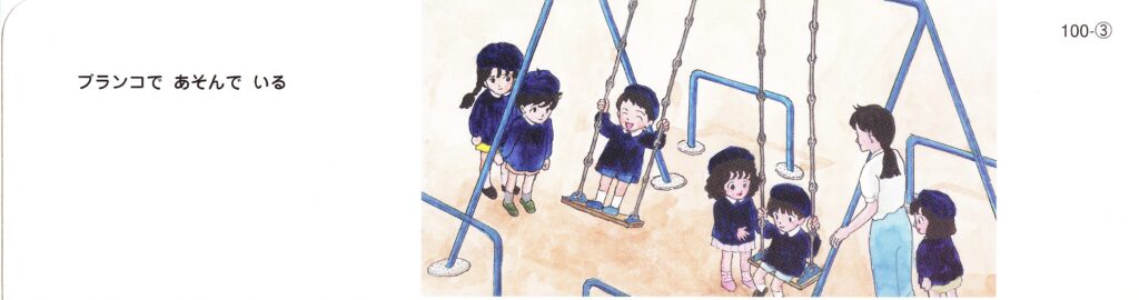 上記の絵を見て、子どもが「くつはいている」と言い、母親が「じゃ、次の絵は何をしてるの?」と聞くと、子どもは「お散歩してる」と答えます。母親は「そうだね、お散歩してるんだね、どこを歩いているの?」と聞くと子どもは「川」と答えます。母親は「そうだね、川べりを歩いているんだね、公園に着いたら何をするの?」と聞きます。子どもは「ブランコ乗るの」と答え、母親は「そうだね、公園でブランコ乗るんだね」と答えます。