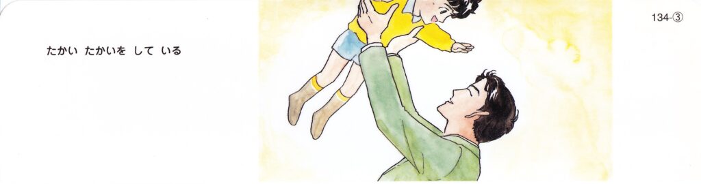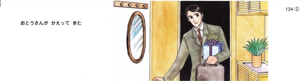 上記の絵を見て、母親が「何がなっているの?」と聞くと、子どもは「ピンポン」と言う。母親が「そうだね、チャイムが鳴っているね、誰が帰ってきたの?」と聞いて、子どもは「パパが帰ってきた」と答えます。母親は「そうだね、パパがお家に帰ってきたね、おみやげ持っているね」と言うと子どもは「プレゼントだ!」と言います。母親が「そしてパパは何してくれるの?」と聞くと「高い高いしてる」などと答えます。一緒に生活し、活動しているとき、子どもの発話にまだ含まれていない次に展開されることはなんだろうときくと、子どもは次の展開を予想して発語が出てくる。そのようにして、2人のやり取りの中から次々文の発語が生れてきます。これが、ことばの創発と文の生成いう現象です。