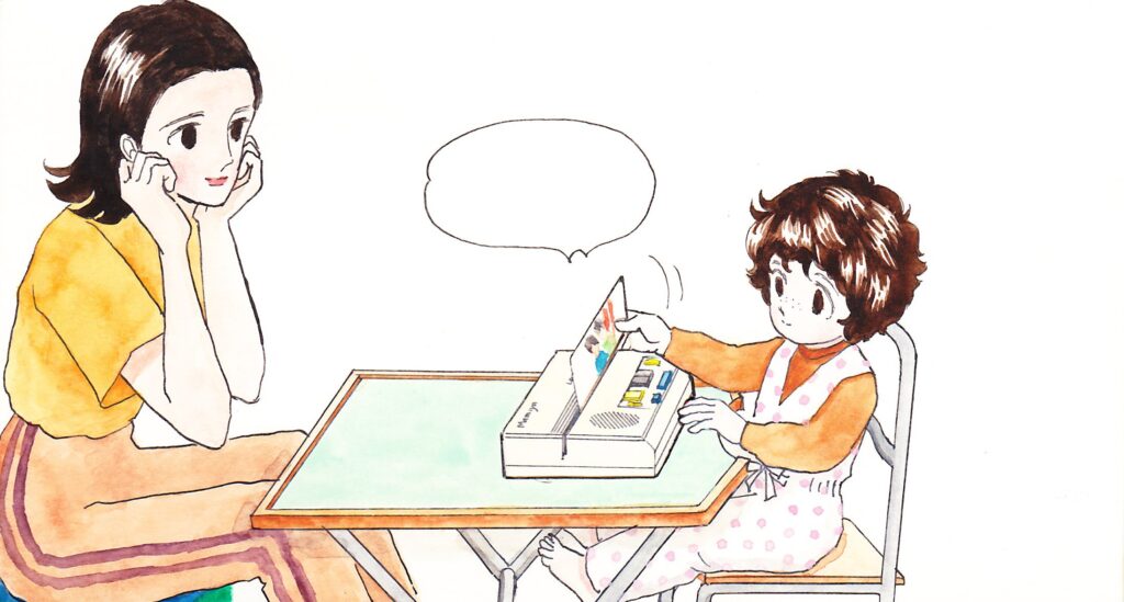 ある子どもを指導している時、ギャーギャー怒りながら、子どもが何かを指さしていて、先生も母親もわからず、「ボールなの?」「箱車?」と聞いて出してみるが違う様子。その時母親が前日やった風船に水を入れて遊んだことを思い出し「ふうせん?」と聞くと頷くので大型風船を持ってくると、手で小さい恰好をして膨らませる格好をする。母親が「小さい風船」と聞くと頷いて「ふうせん」という。それで小さい風船を持ってくると喜ぶ。また、別の日、箱車を指さすので出すと、今度は大きなベニヤ板を指さす。「滑り台するの?」と聞くと「シュー」と言う。相互行為している中で、お互い分かり合える発語が生れています。また、単語が中心の子どもでも、トーキングカードで指導している時、知っているものが出てきて「○○家にある」という3語文の表現が出てくるこどもがいます。これは何々であると説明しようとしています。