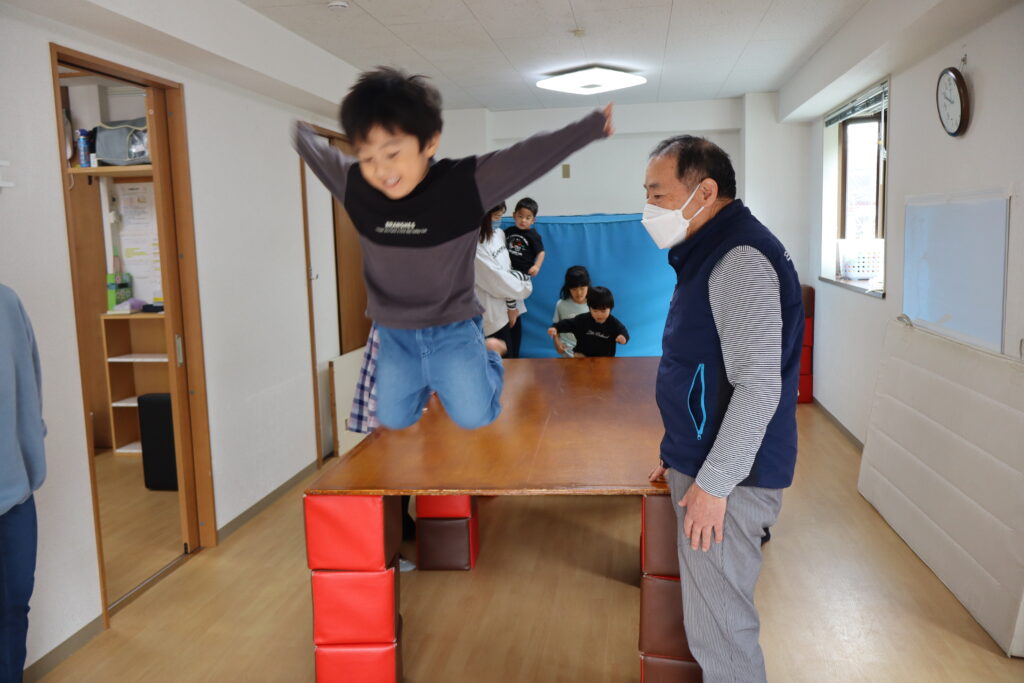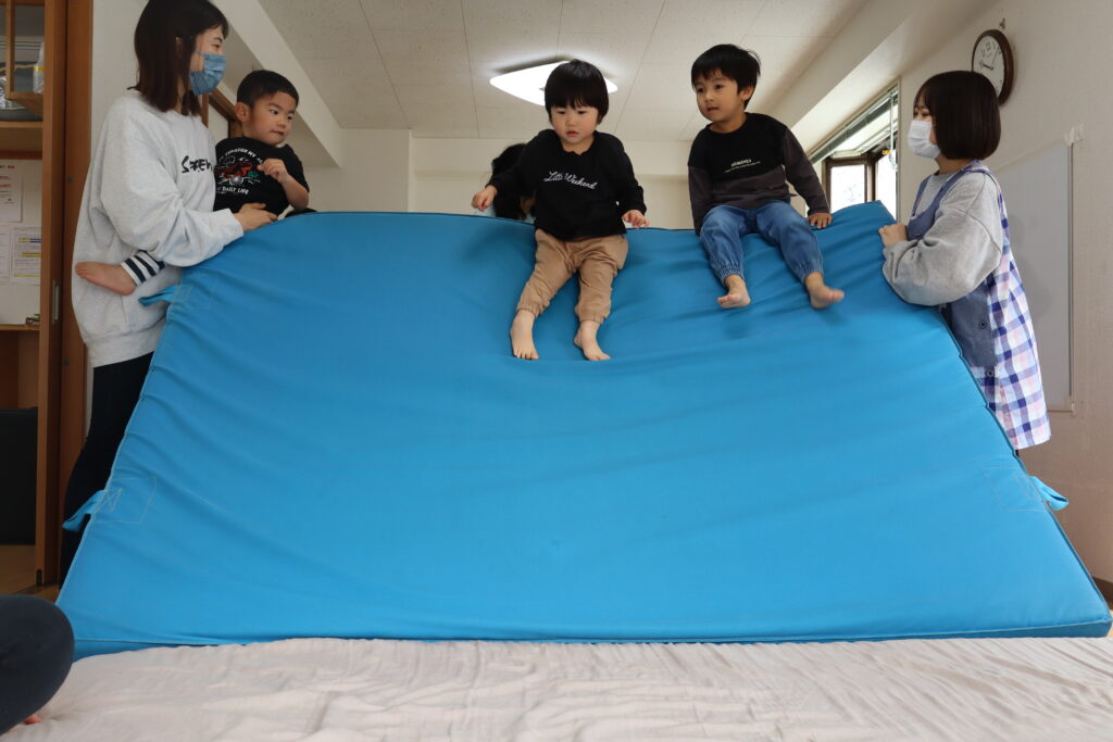 ブロック倒しやジャンボマットのトンネルくぐりなど、状況との即応的な活動からベニヤ板の上を目標に向かって歩いていく、滑っていく、駆け降りる、ジャンボマットのお山を登って滑り降りるなど目標に到達するまで時間がかかり、努力感が必要な場合、目的意識を持続する必要があります。